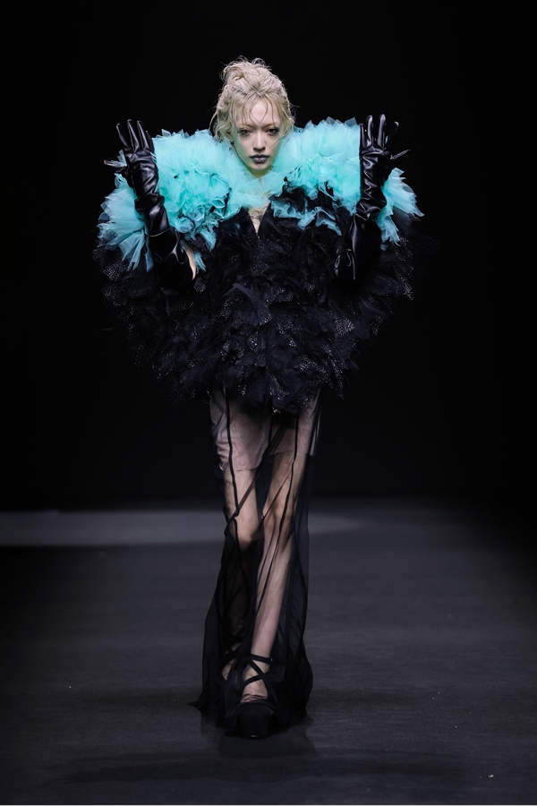 本季系列以“故障深渊”为主题,设计师任柯明从北欧神话中汲取灵感,将深海传说中神秘、魅惑与力量感转化为具象的时装语言。通过流动感极强的面料模拟海水韵律,配以深海蓝、珠光白与金属鳞片的色彩碰撞,服装在光影间折射出如海底波光般的变幻效果。