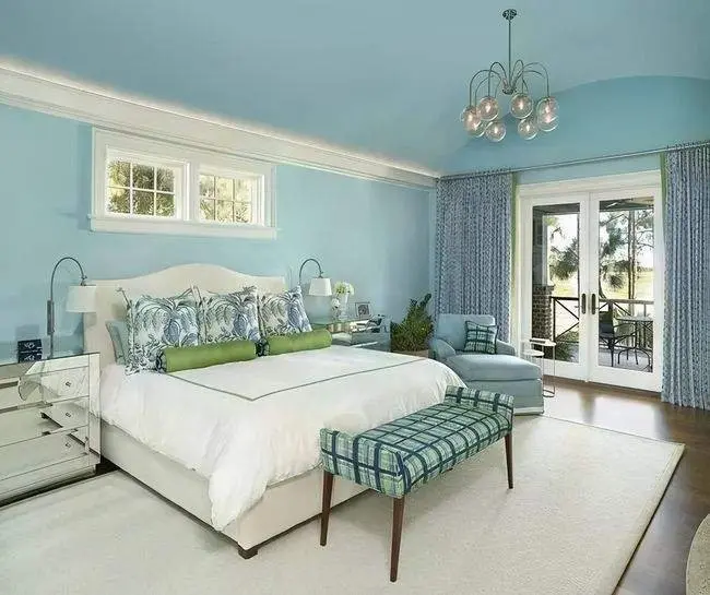 给人以自然、贴近、富有亲和力的质感,白色实木家具,渐变的绿色墙面,硅藻泥印花卧室背景墙,渲染出雅致宁静的卧室氛围,搭配柔和的灯光,如优雅成熟的中年女子含蓄温婉内敛而不张扬,散发着从容淡雅的生活气息。